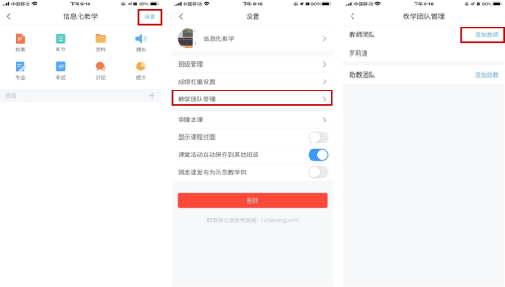 手机端:进入一门课程——右上方“设置”——“教学团队管理”——“添加教师”。